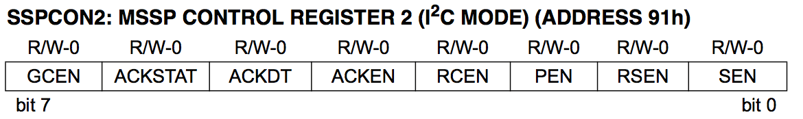 Once the bus is known to be idle, we can send a start condition. This is done by setting the SEN bit of the SSPCON2 port. This is will make the MSSP port of the controller to drive the SDA line low while keeping the SCL high effectively reserving the I²C bus. Once the event has finished the bit is automatically cleared. We can use this to query for the end of the start condition:
